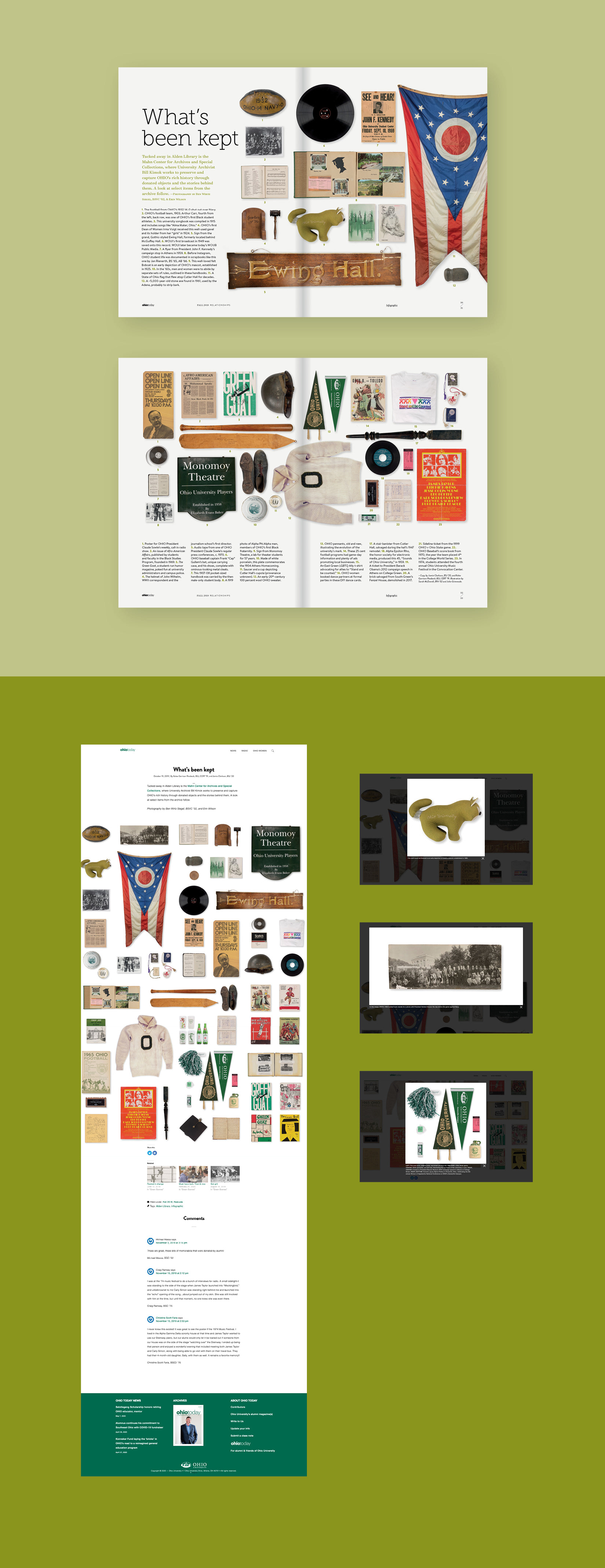 Print and digital infographic design for Ohio Today magazine, featuring digital archival display of alumni donated Ohio University memorabilia. For further review visit: ohiotoday.org/whats-been-kept/